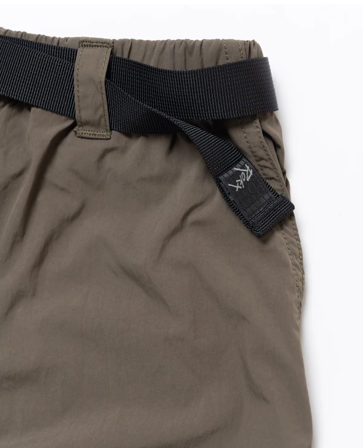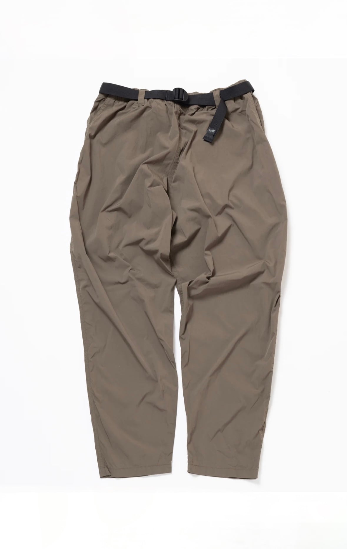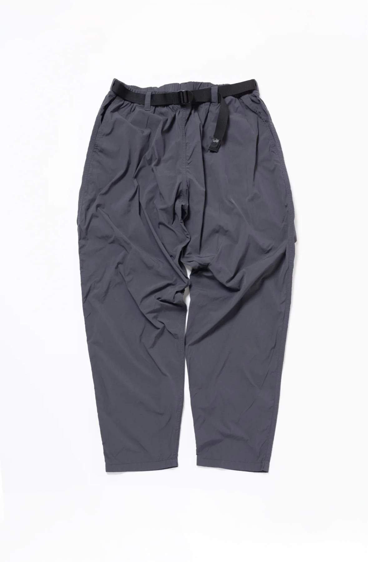 ウェビングベルトを表に出したデザイン、独特のヒップ部分のパネルデザイン、極太なシルエットなど、ほかにないディティールが目を引くパンツです。