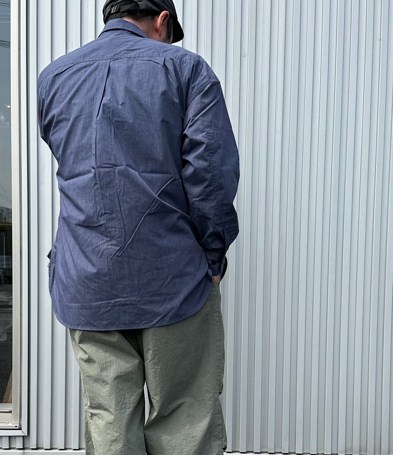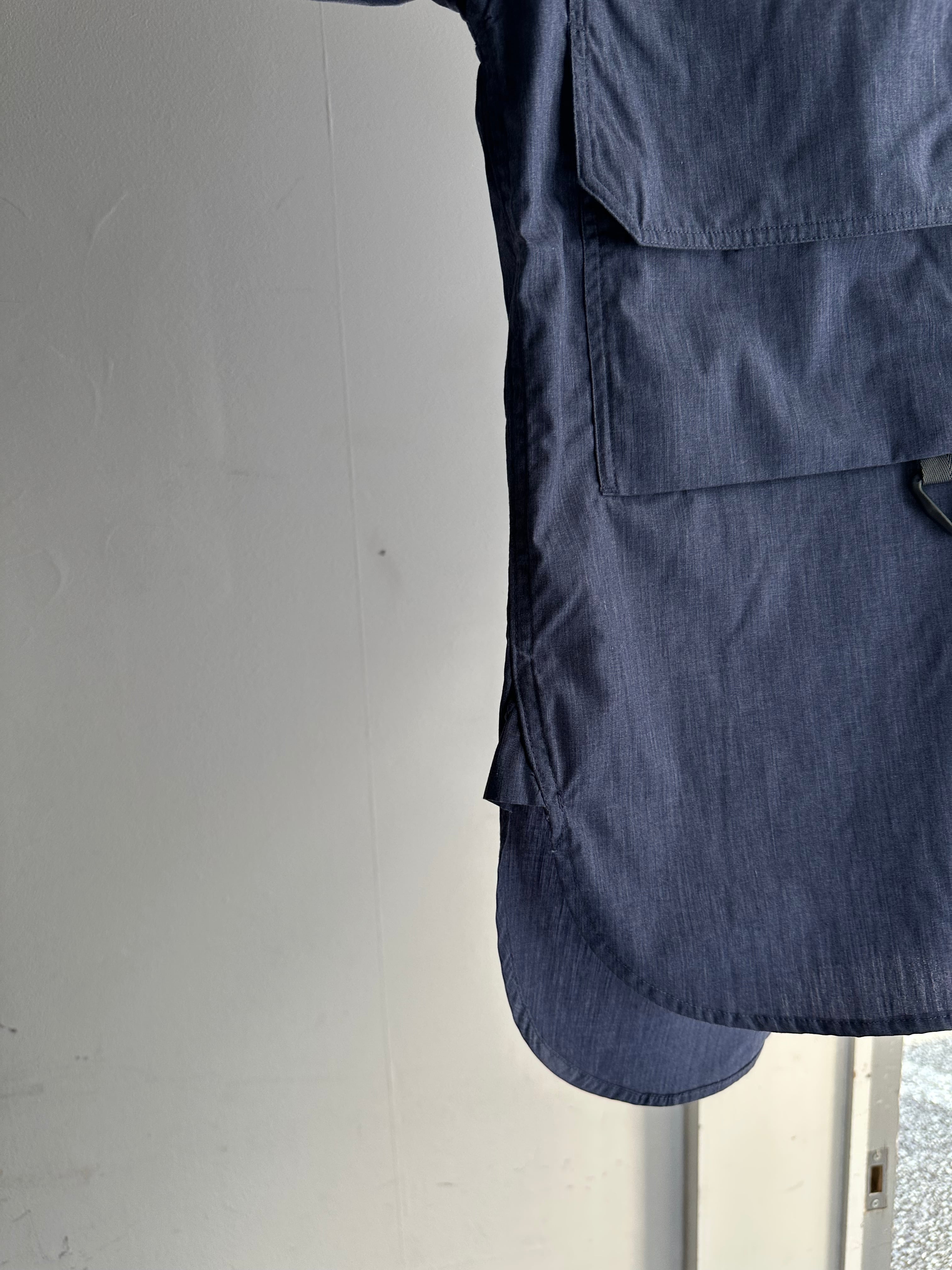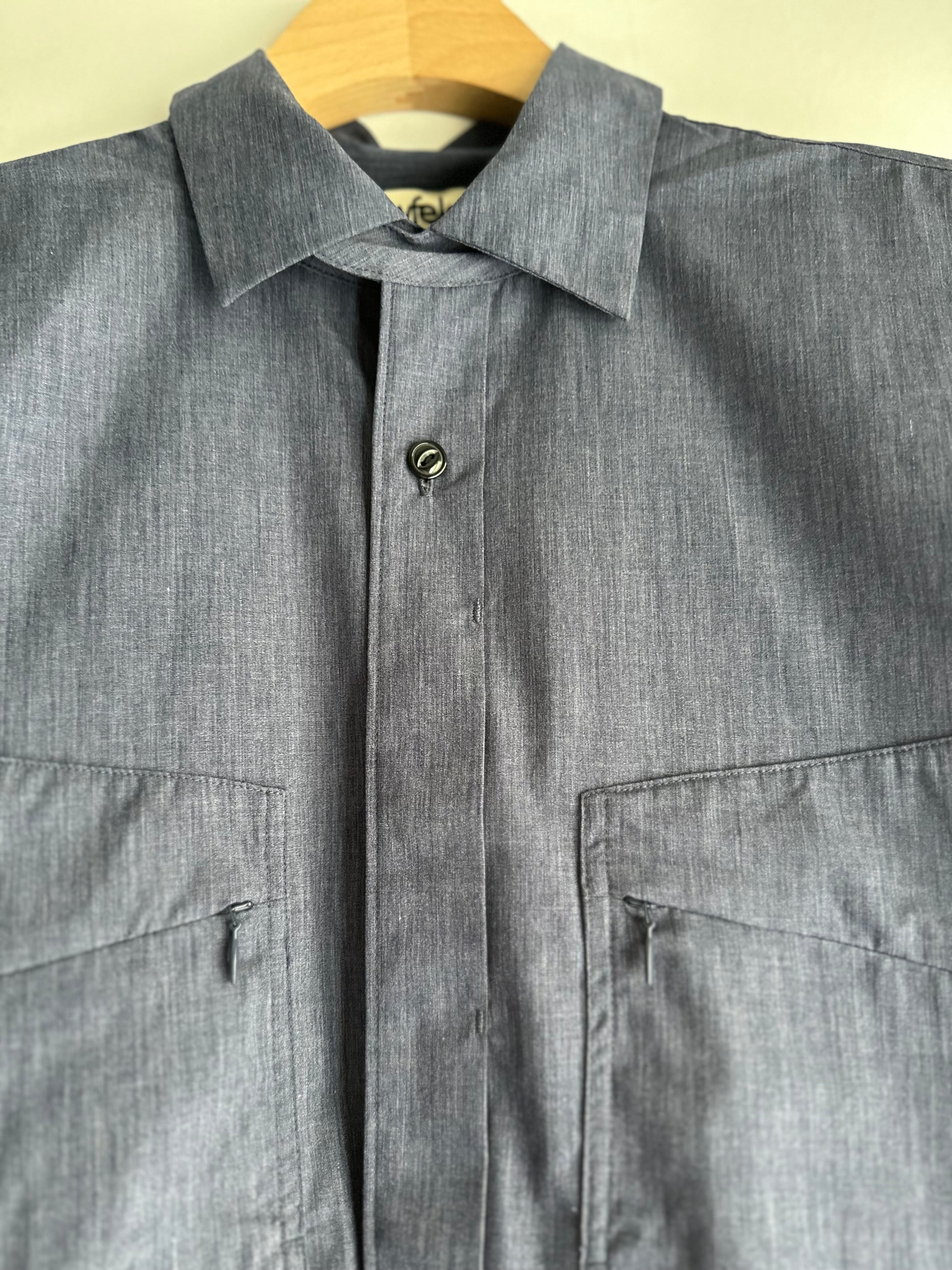 キャンパーズシャツは、フロントのポケットデザインを狩猟用ジャケットのポケットから着想を得てアレンジしたデザイン。袖口〜肘周りや、襟周りや、裾脇のガジェットなど、デザインでさりげなく他と差がつくシャツになっています。そのほか、メインのボタンも第1ボタンはスナップボタン、第2ボタンは見えるボタン留め、第3ボタン以降は前立てで隠したりとユニークな仕上がり。