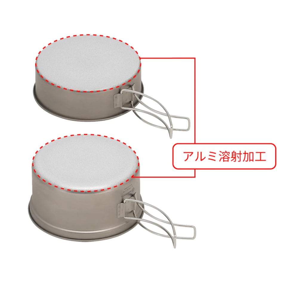 チタントレールクッカーのポットとフライパンへアルミの溶射0.4mmを施すことにより熱効率がアップした、調理のしやすい軽量クッカー。